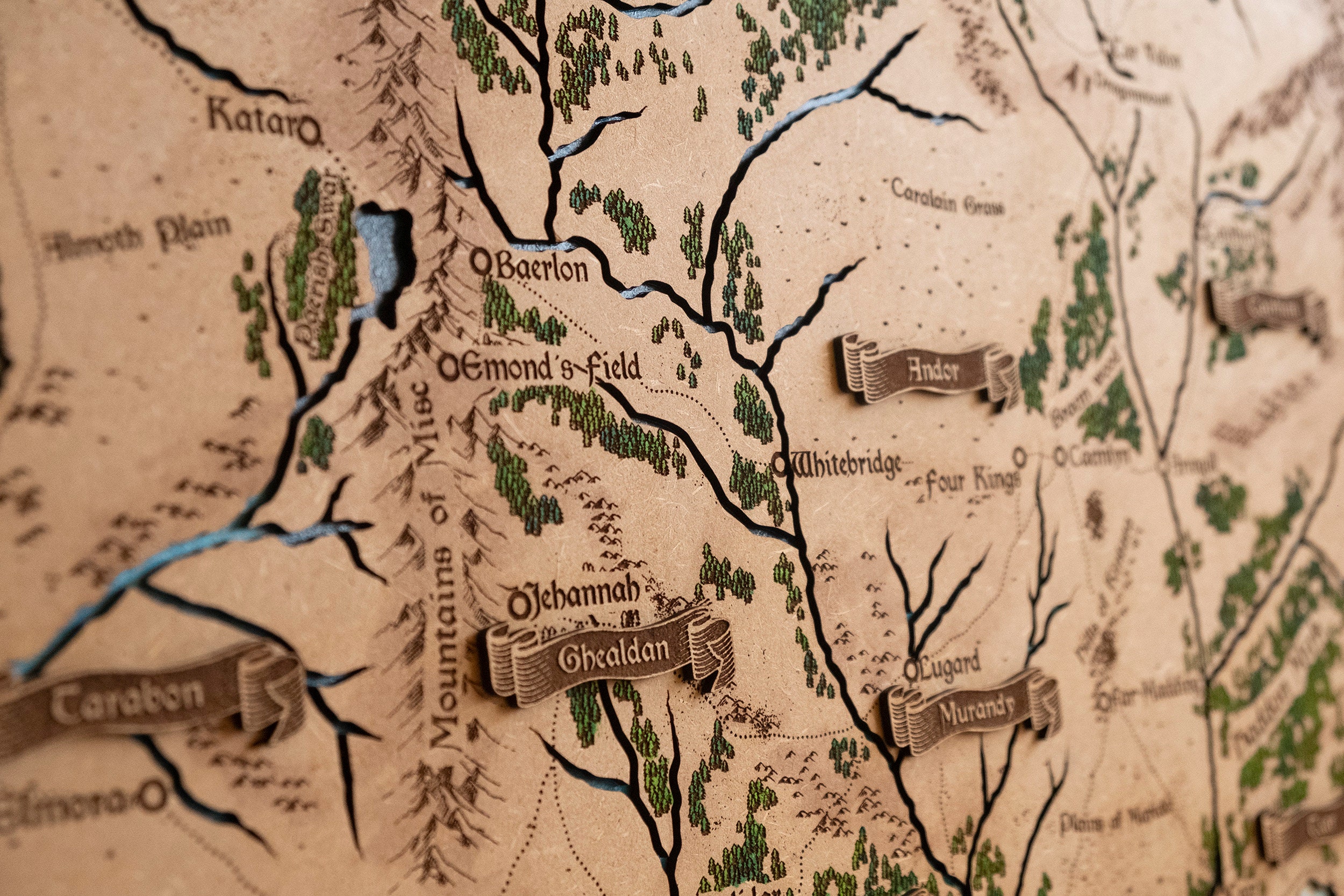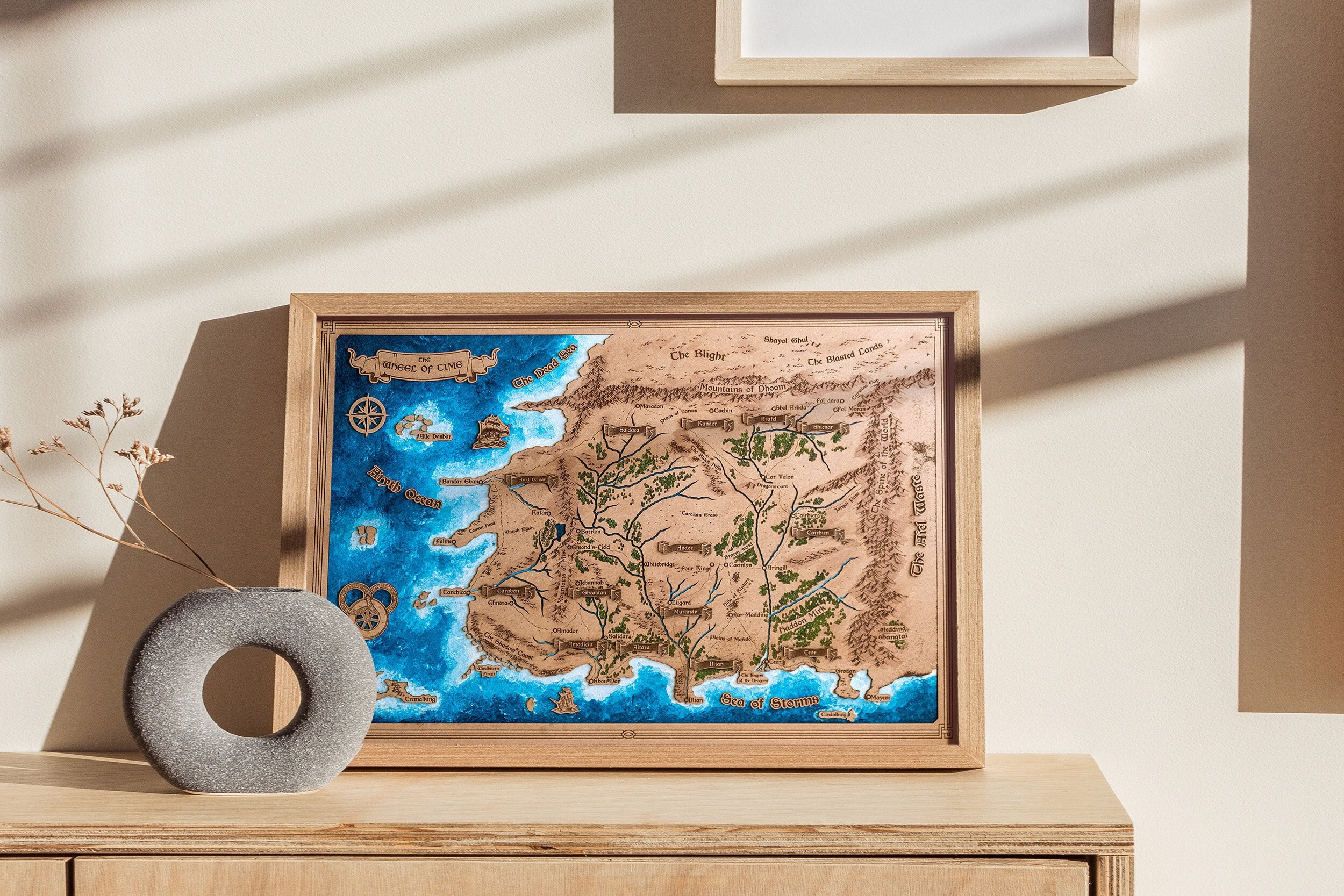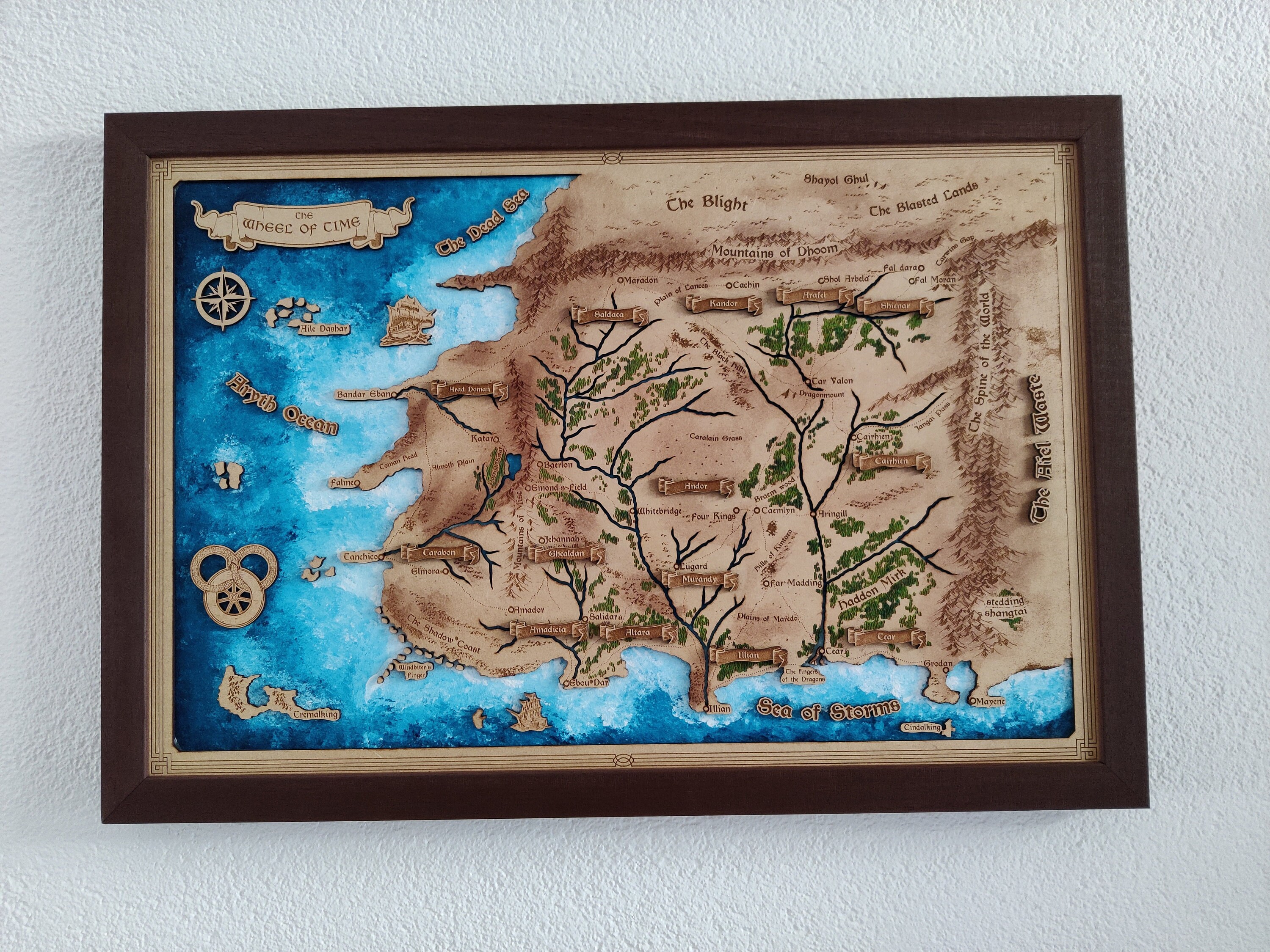 The Wheel of Time custom wooden map or any other style of map. The Wheel of time map, laser engraved on wood (mdf) and hand painted in blue, trees painted green and darkened mountains stained walnut