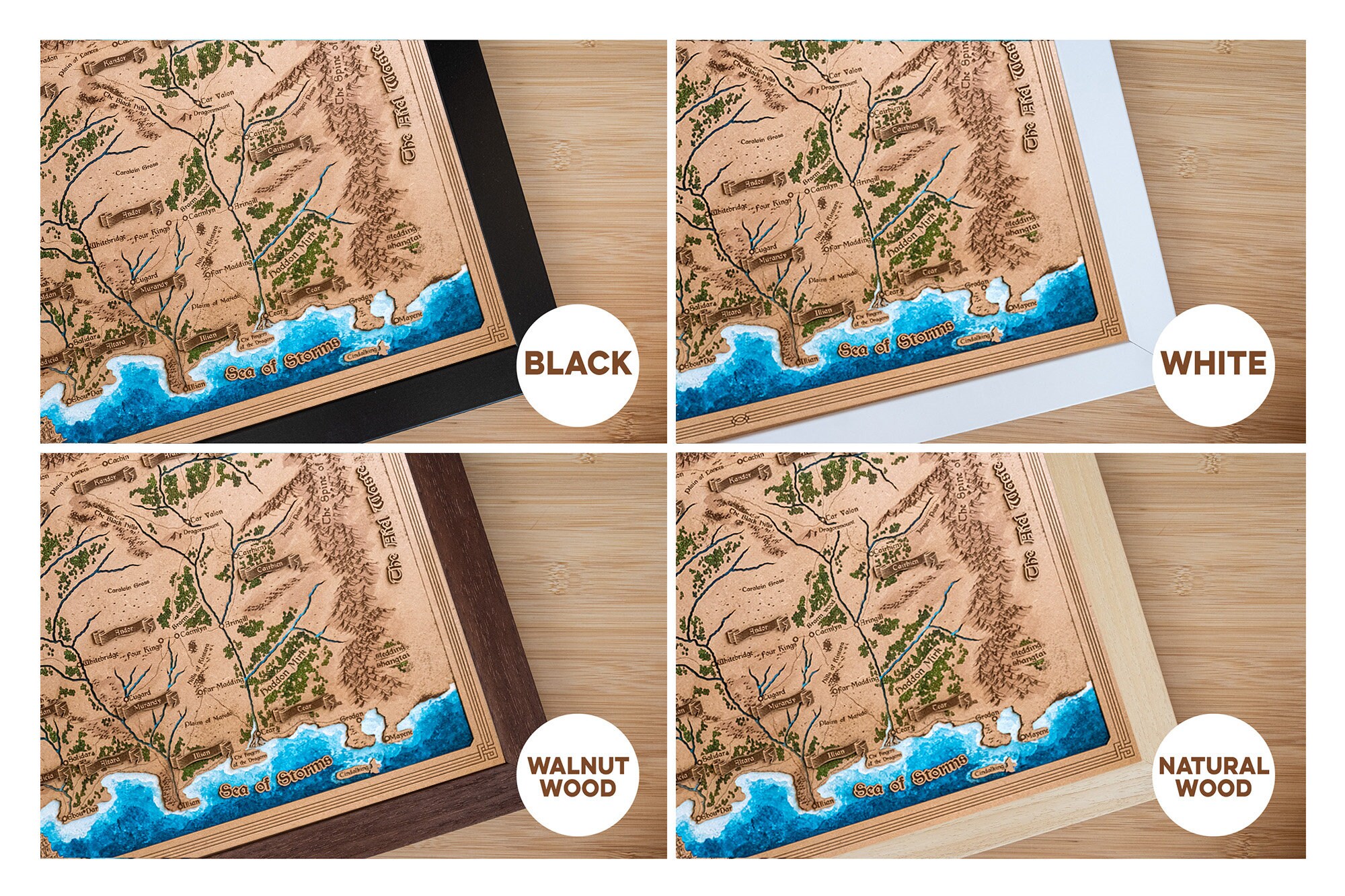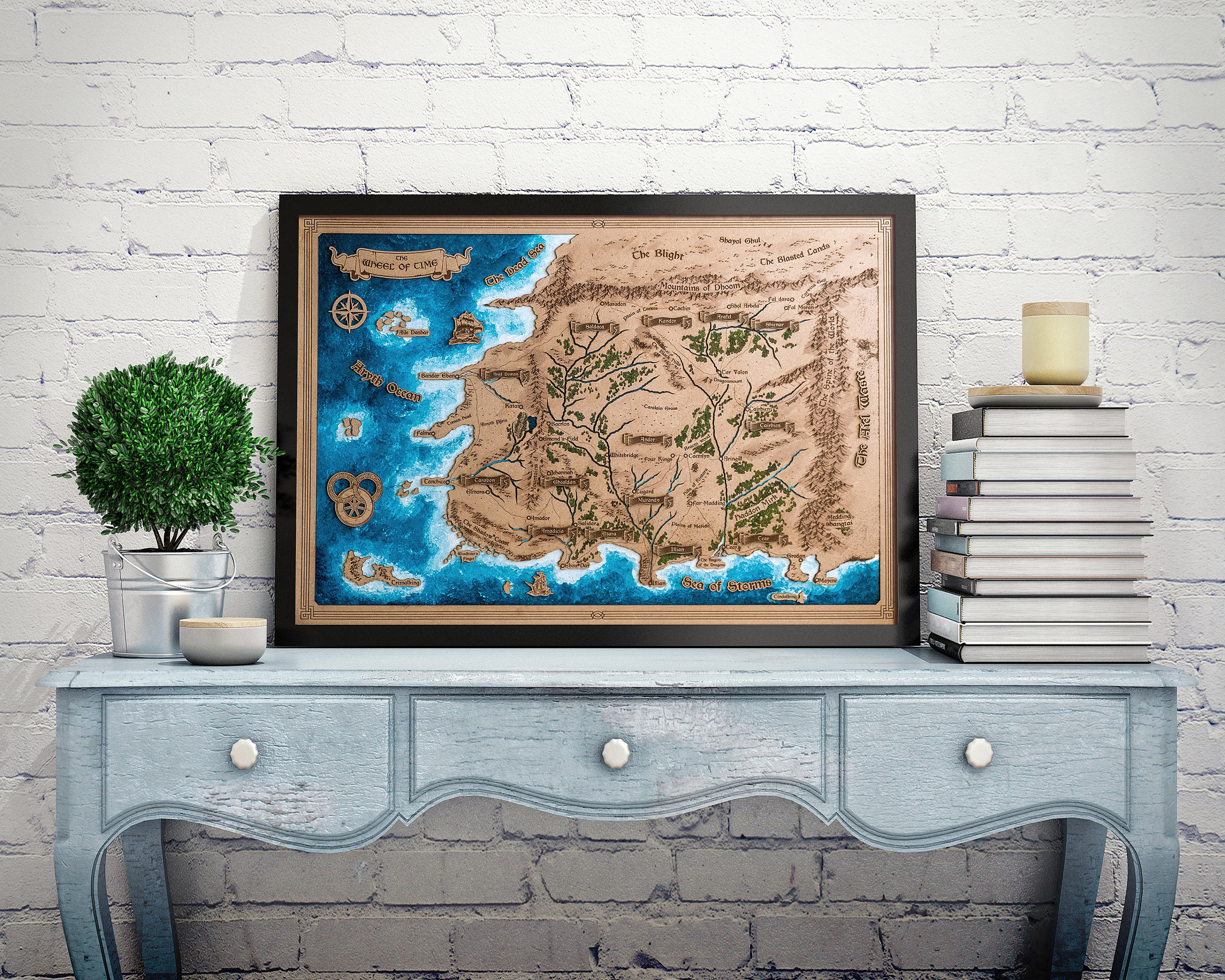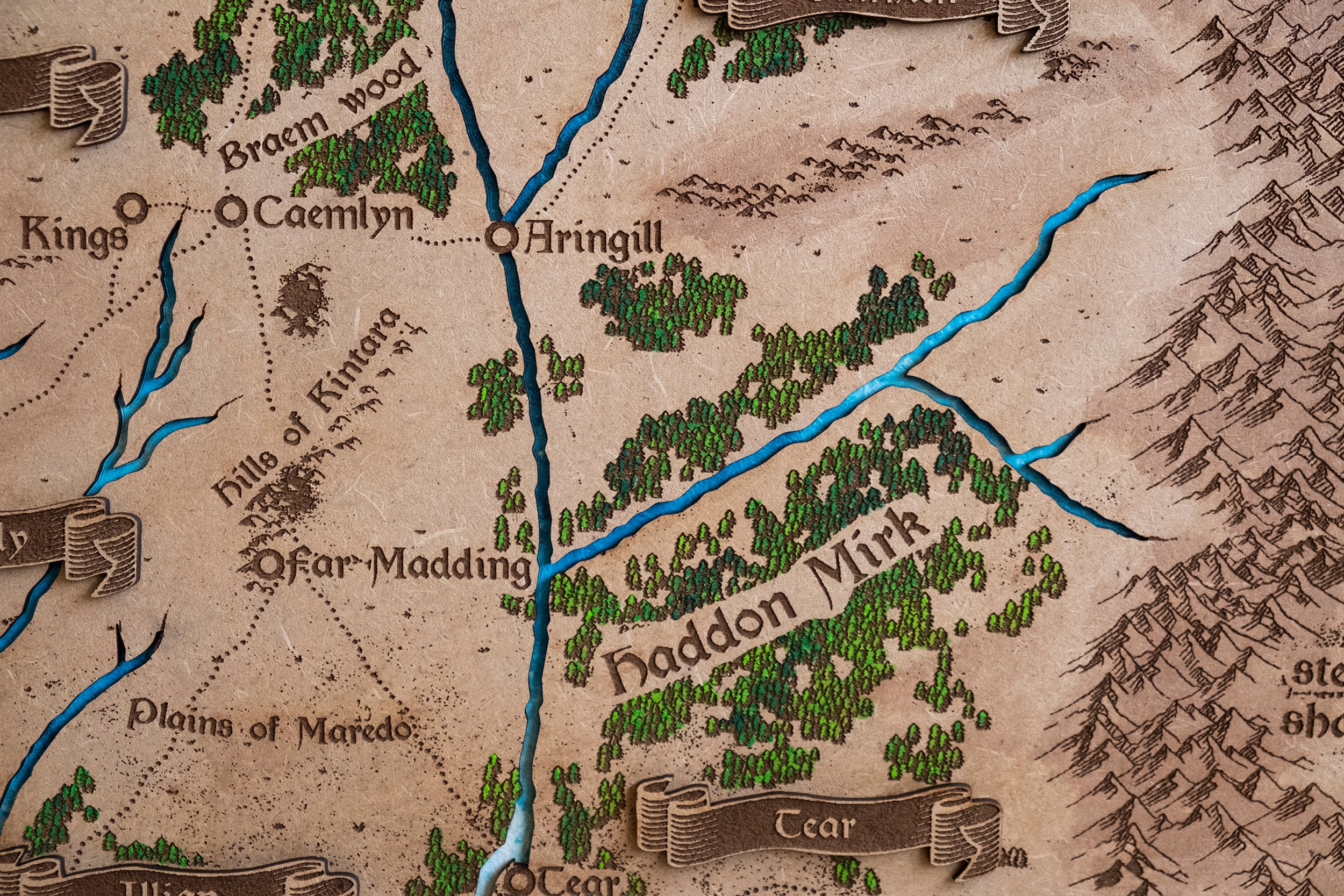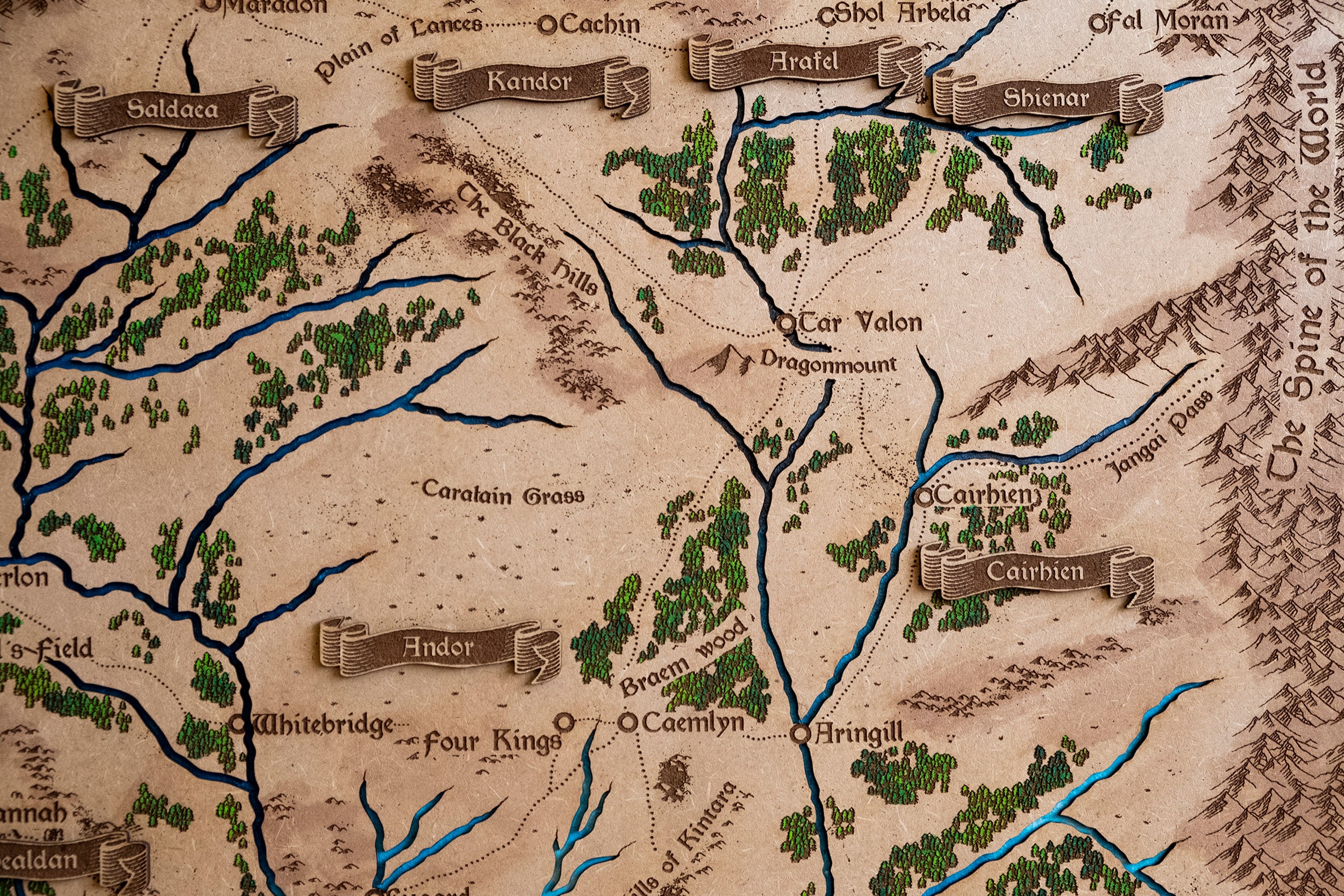 The Wheel of Time custom wooden map or any other style of map. The Wheel of time map, laser engraved on wood (mdf) and hand painted in blue, trees painted green and darkened mountains stained walnut