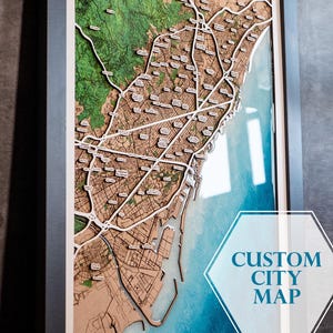 Artistic 3d map, personalized of any area or city in the world, laser cut.